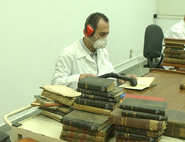 In the workshops located at the Port of Beirut, where the boxes containing the old collection of the National Library were moved, a processing chain was established to treat the existing collection. :